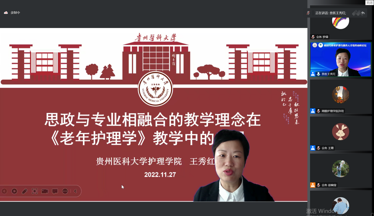 公司williamhill中国官网入口副经理王秀红副教授以“思政与专业相融合的教学理念在《老年护理学》教学中的应用”为题,分享了在《老年护理学》课程教学实施过程中要明确老年护理“为谁培养人?培养什么样的人?如何培养人?”三个核心问题,以立德树人为根本,通过“四贯通一并举”将思政与专业相融合的教学改革的策略及方法有效应用于教学中。