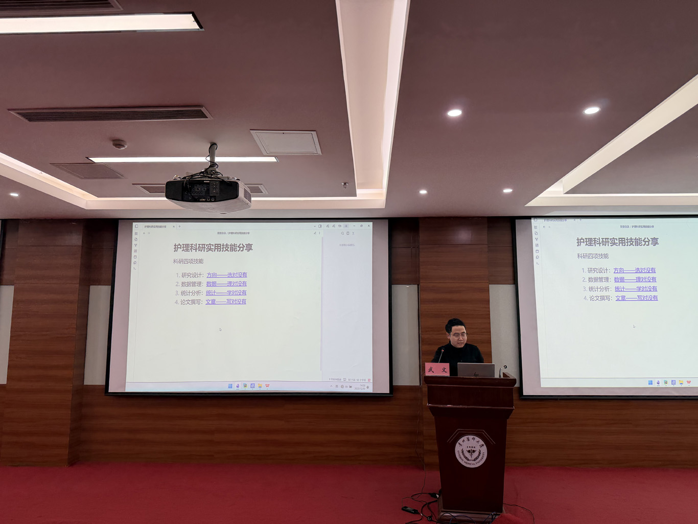 武文以“护理科研实用技能分享”为主题进行系统讲解。他结合自身科研实践,围绕护理研究选题、数据收集与整理、统计分析和论文撰写等关键环节展开阐述,强调研究选题应兼具创新性与可行性,并重点讲解了数据清洗、质量控制及常用统计方法的应用要点,完整呈现了从课题设计到成果发表的科研全过程,为师生提供了扎实的方法指导与实践参考。