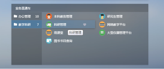 第一步:进入oa系统,业务直通车,点击教学科研中“科研管理”(也可通过williamhill中国官网入口科学技术网站链接进入科研管理系统,账号密码如未修改,都默认为职工号或是身份证号后六位)