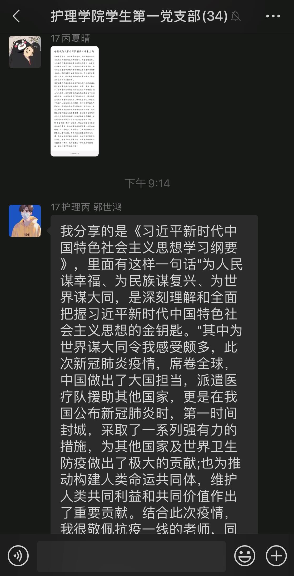 李颖首先介绍了阅读对个人成长成才的重要性,并分享了《共产党宣言》的阅读体会。她从马克思、恩格斯受共产主义者同盟委托撰写同盟纲领讲起,分享了《共产党宣言》的诞生背景、主要内容和重要意义。接下来,支部党员依次推荐一本自己读过的书籍,和大家交流自己从中受到的启发和思考。讲者细致,听者认真,三个小时的时间不知不觉就过去了。其间,郭世鸿结合新冠肺炎疫情,分享了自己对《习近平新时代中国特色社会主义思想学习纲要》的学习心得和对人类命运共同体理念的深刻领悟。仇志琴谈到“作为一名护生和未来的护理人员,这次疫情让我对如何处理好护患关系有了更多的思考。于是我走进了《人性的弱点》这本书,它教会我如何去管理情绪,去与人沟通,做到共情。”罗国淋在分享《钢铁是怎样炼成的》读后感时说:“因为我们信仰有理想,所以我们一起合力去战胜这次疫情,因为我们热爱那车水马龙的生活,所以我们迎难而上。”有力的话语道出了青年党员的初心、觉悟和担当。