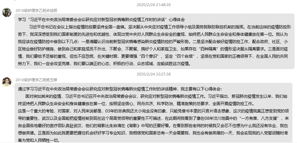 余佳丽在分享自己的战“疫”事迹时说:“作为一名正在实习的医员工和员工党员,这样的双重身份,面对当前疫情我责无旁贷,看到前辈们驰援一线,让我想起刚入校门时的医员工誓言:我志愿献身医学,热爱祖国,忠于人民,恪守医德,尊师守纪……习近平总书记强调,我们要按照坚定信心、同舟共济、科学防治、精准施策的要求,切实做好工作,同时间赛跑、与病魔较量,坚决遏制疫情蔓延势头,坚决打赢疫情防控阻击战。现在我还没有能力参与到一线抢救患者,看到疫情蔓延,既然上不了前线,那就在后方为防控疫情出一份力。”