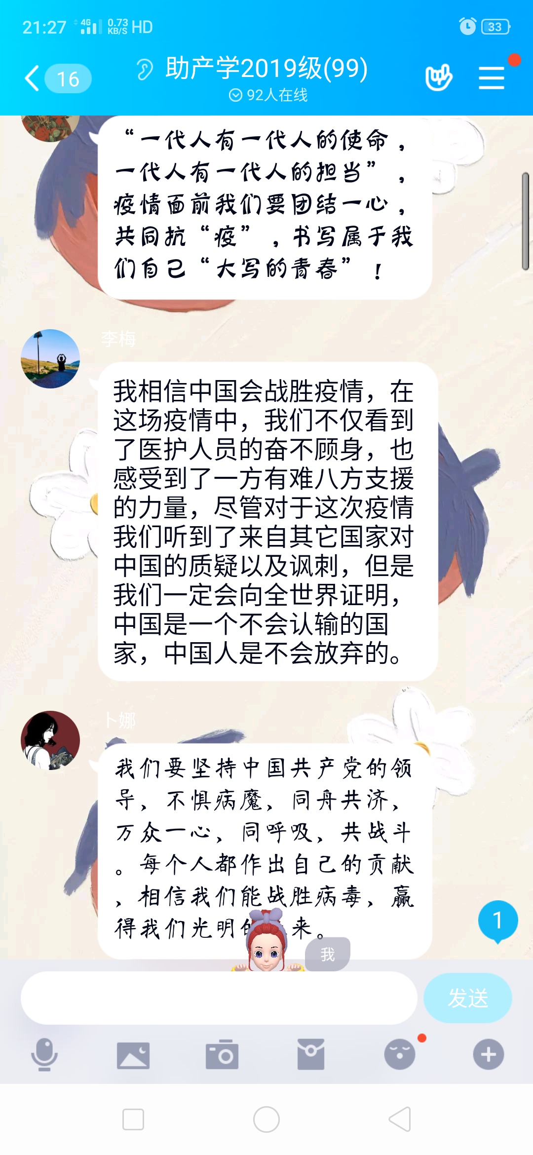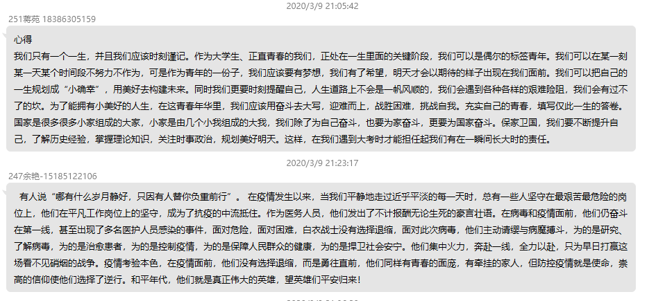 课程结束后,各班同学通过QQ群、微信群、腾讯会议等平台围绕课程内容和自身实际开展在线讨论,分享所学、发表感悟、交流心得。通过学习讨论,同学们主要有以下收获:一是要热爱党和国家。同学们相信在党和国家的领导下,我们一定可以打赢这场疫情防控的人民战争。二是要坚定“四个自信”。同学们从这场疫情防控阻击战中进一步增强了道路自信、理论自信、制度自信、文化自信。三是要服务人民群众。同学们认识到了要努力学习知识,积极进行实践,增强服务人民群众的本领。四是要勇于担当作为。同学们认识到了“白衣天使”是战“疫”一线“最美逆行者”,要向“白衣天使”学习,用心守护着每一个病人的生命安全。五是要保护自然环境。同学们认识到了自然环境是人类社会赖以存在的基础和前提,要遵循自然规律,保护生态环境和野生动物。六是要珍视生命健康。同学们认识到生命健康是幸福生活的重要前提,要热爱生命,保障健康。