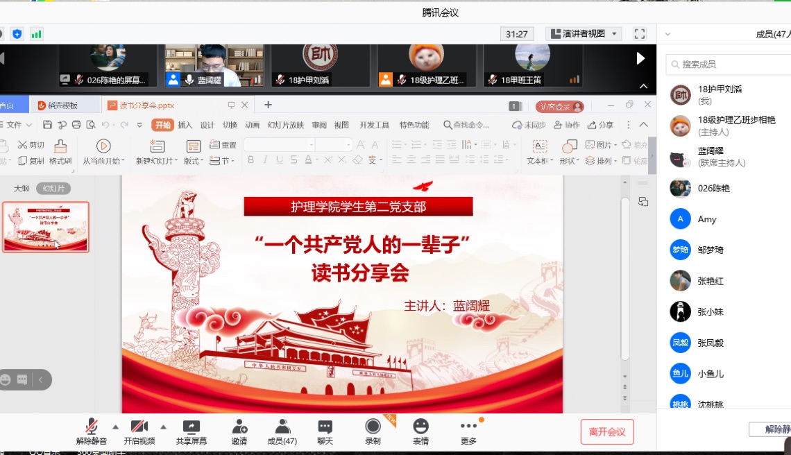 1月18日,williamhill中国官网入口员工第二党支部为丰富“不忘初心、牢记使命”主题教育学习形式,全力推进队伍文化建设,提高党员文化素养,营造崇尚学习的浓厚氛围,组织党员同学通过腾讯会议开展线上“一个共产党人的一辈子”主题党日活动,本次活动由员工第二党支部书记李杏春主持。
