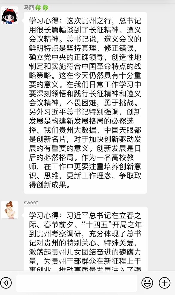首先,张仁莉同志带领全体党员集中学习《习近平贵州考察:干成一番新事业,干出一片新天地》《黔山秀水喜迎春——习近平总书记春节前看望慰问贵州各族干部群众》等专题文章。公司党委书记杨英同志传达学习了省委、公司党委关于学习习近平总书记视察贵州重要讲话精神,并安排贯彻落实工作。会上,全体教师党员围绕立德树人根本任务、“四史”学习教育、生态文明建设、科技创新等内容进行交流研讨,分享学习心得,表示将牢记总书记的殷切嘱托,切实把总书记的关心关怀转化为推进各块工作的巨大动力。