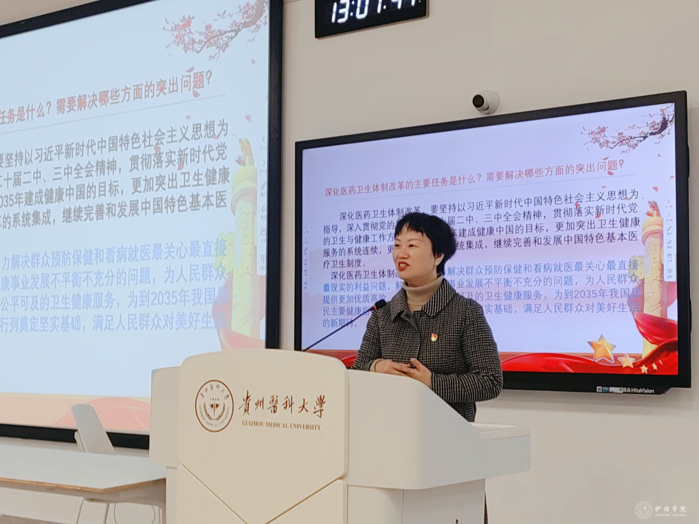 11月25日,为引领williamhill中国官网入口的研究生群体深入领悟党的二十届三中全会精神,切实将守护人民健康的使命扛在肩头、落在行动,williamhill中国官网入口党委委员、副经理王秀红,在员工第四党支部开讲专题党课,主题为《深刻领会党的二十届三中全会精神,为人民健康努力拼搏》,支部书记殷艳主持,全体党员及护理研究生参会。