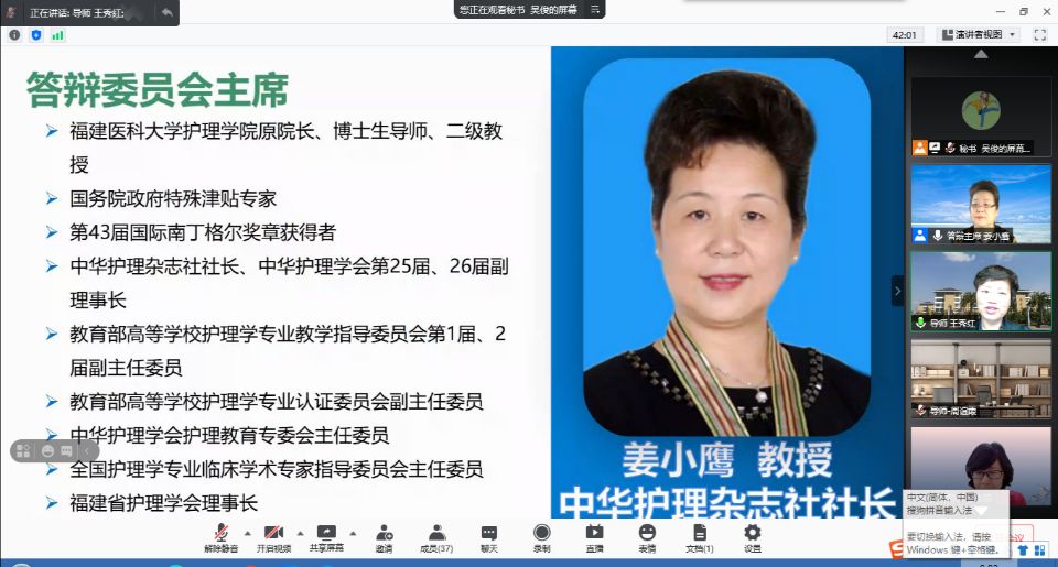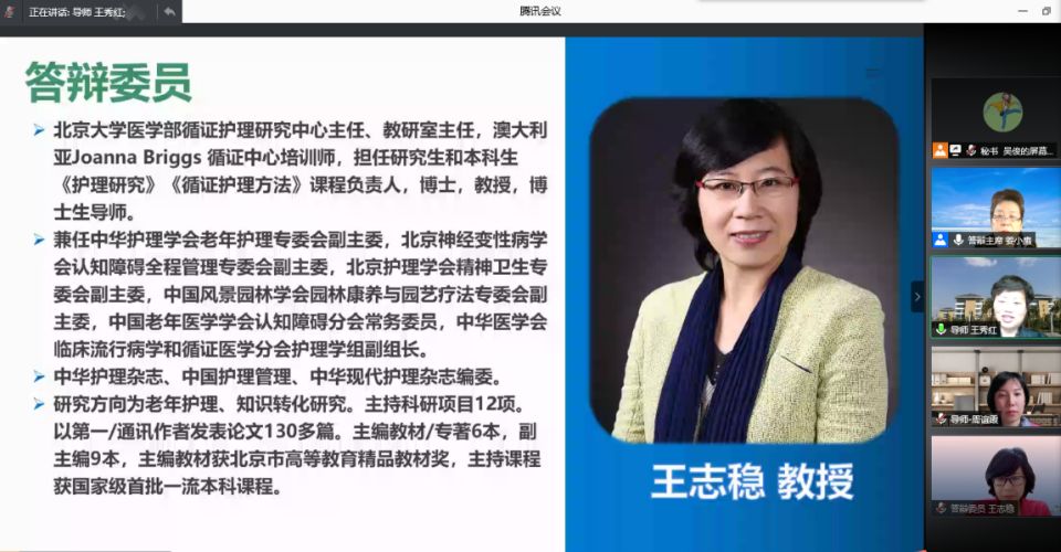 5月20日,2021届硕士研究生学位论文答辩通过腾讯会议在线进行。此次答辩特别邀请福建医科大学williamhill中国官网入口原经理、中华护理杂志社社长姜小鹰教授任答辩委员会主席,天津医科大学研究生常务副经理赵岳教授、循证护理研究中心主任、教研室主任王志稳教授、基础医公司副经理舒莉萍教授以及williamhill中国官网入口公共卫生公司汪俊华副教授担任答辩委员。williamhill中国官网入口导师、副导师、专业教师、研究生等50余人参加本次会议,研究生院督导专家全程参与。