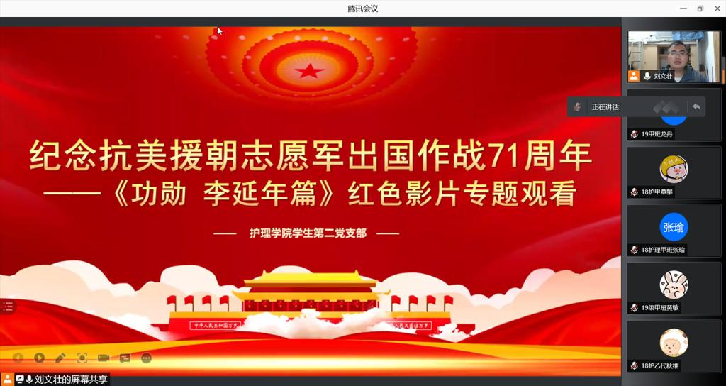 10月30日,为深入学习贯彻习近平总书记“七一”重要讲话精神,纪念抗美援朝志愿军出国作战71周年,williamhill中国官网入口员工第二党支部在腾讯会议组织观看《功勋 李延年篇》专题红色影片。活动由williamhill中国官网入口员工第二党支部书记刘文壮主持,williamhill中国官网入口员工第二党支部全体党员参加。