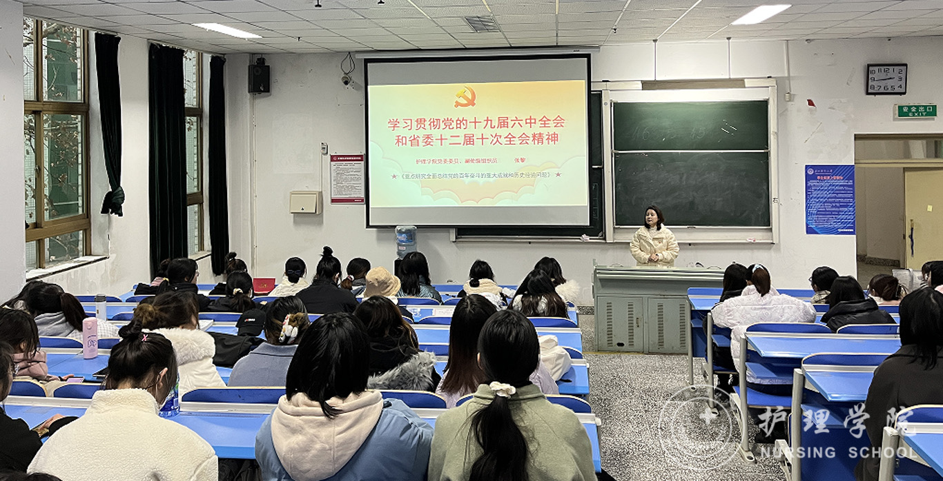 12月29日,为深入贯彻学习党的十九届六中全会精神和省委十二届十次全会精神,引导广老员工领悟全会精神实质、准确把握核心要义,williamhill中国官网入口党委委员、副处级组织员张黎于北校区3301教室开展了党的十九届六中全会精神和省委十二届十次全会精神宣讲报告。会议由williamhill中国官网入口员工第一党支部书记杨叶卿主持,2019级护理学丙班全体同学及williamhill中国官网入口员工第一党支部党员参加了报告会。