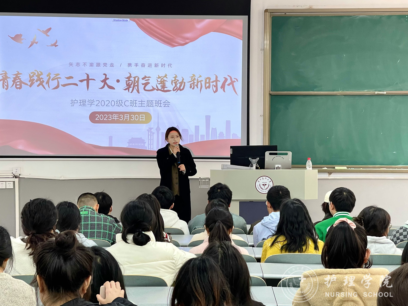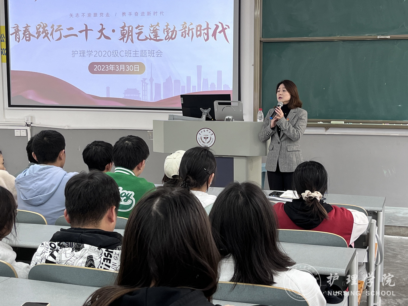3月30日,为深入学习宣传贯彻党的二十大精神,强化思想引领,聚焦立德树人根本任务。williamhill中国官网入口党委委员、副处级组织员张黎到护理学2020级C班开展了“青春践行二十大,朝气蓬勃新时代”主题班会活动,会议由辅导员刘妍主持,班级全体同学参与。