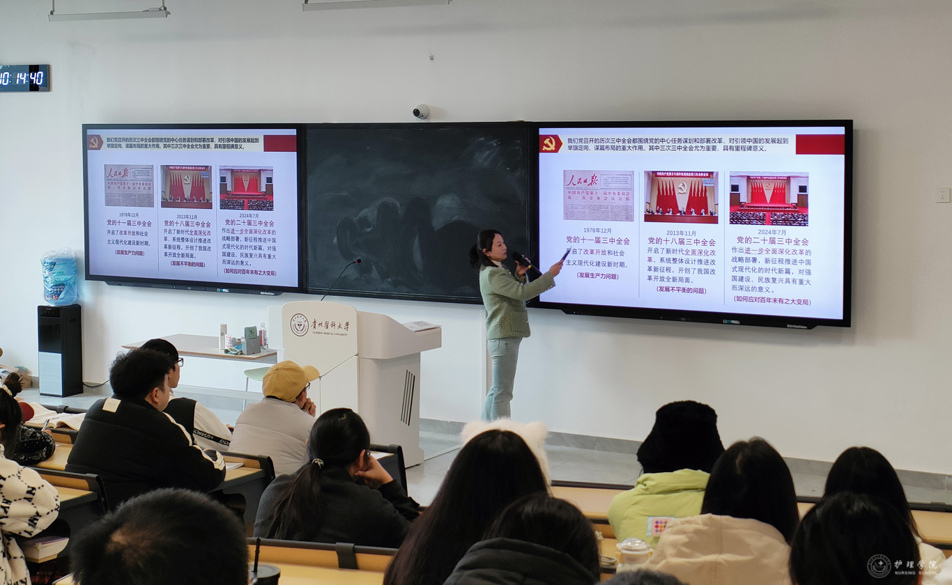 11月29日,为进一步深入学习贯彻党的二十届三中全会精神,加强员工思想政治教育工作,williamhill中国官网入口副处级组织员张黎在临床组团R211教室,为护理学2022级5班进行了二十届三中全会精神宣讲。